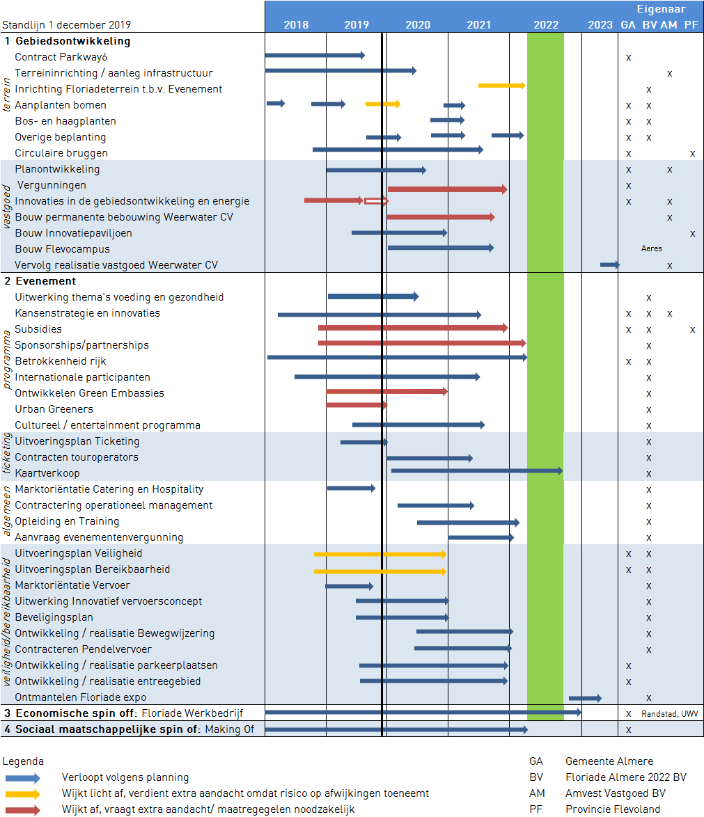 In onderstaand schema wordt voor verschillende programmaonderdelen de planning weergegeven, geordend naar de vier clusters uit de Voortgangsrapportage. De onderdelen die extra aandacht en beheersmaatregelen vragen omdat ze de basisvoorwaarden voor de expo en de Floriade stadswijk raken en op een kritiek pad liggen, zijn oranje/rood weergegeven.