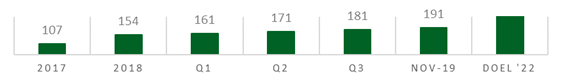 De doelstelling voor 2019 was 30 a 40 plaatsingen. Dit aantal is nog exclusief de doelstellingen die met Amvest en Dura Vermeer overeen zijn gekomen, met oog op de realisatie van vastgoed voorafgaand aan het evenement. Doordat de terreininrichting later op gang is gekomen zijn er tot 1 december 2019 13 nieuwe plaatsingen geweest.